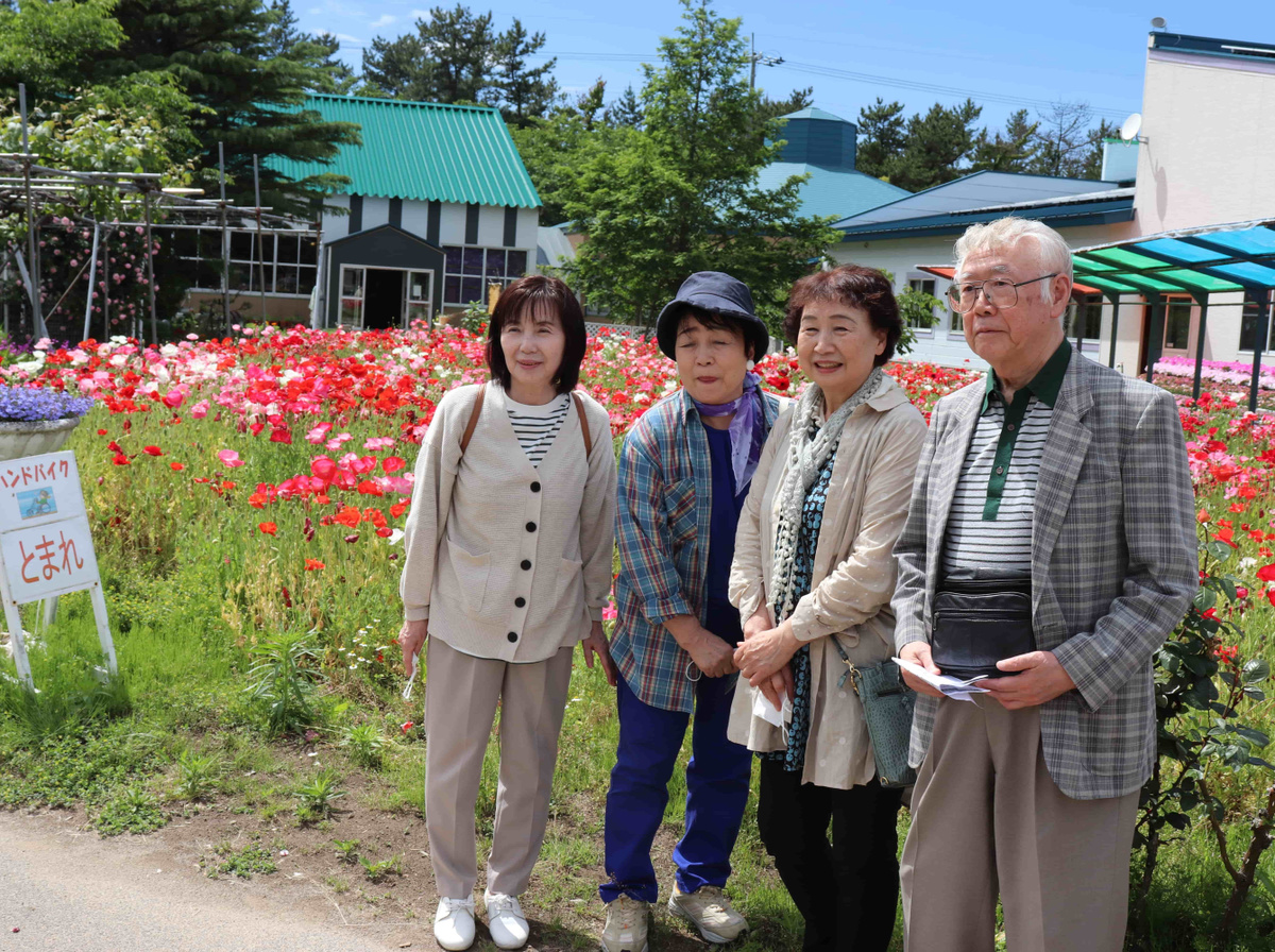 ハーブワールド:けしの花をバックにハイ、チーズ!