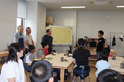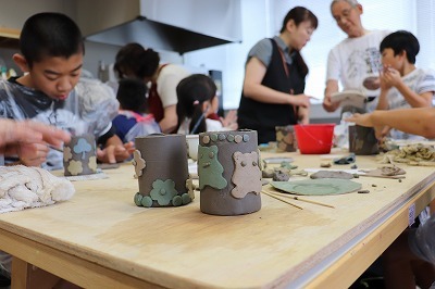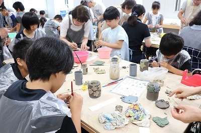 いーぱるのサークルである陶友わかば会が下北手小学校の児童23名を招いて、陶芸体験会を開催しました。同小学校の児童センターに通う子供たちのほとんどが、初めて陶芸に触れ、夏休みの作品づくりをしました。