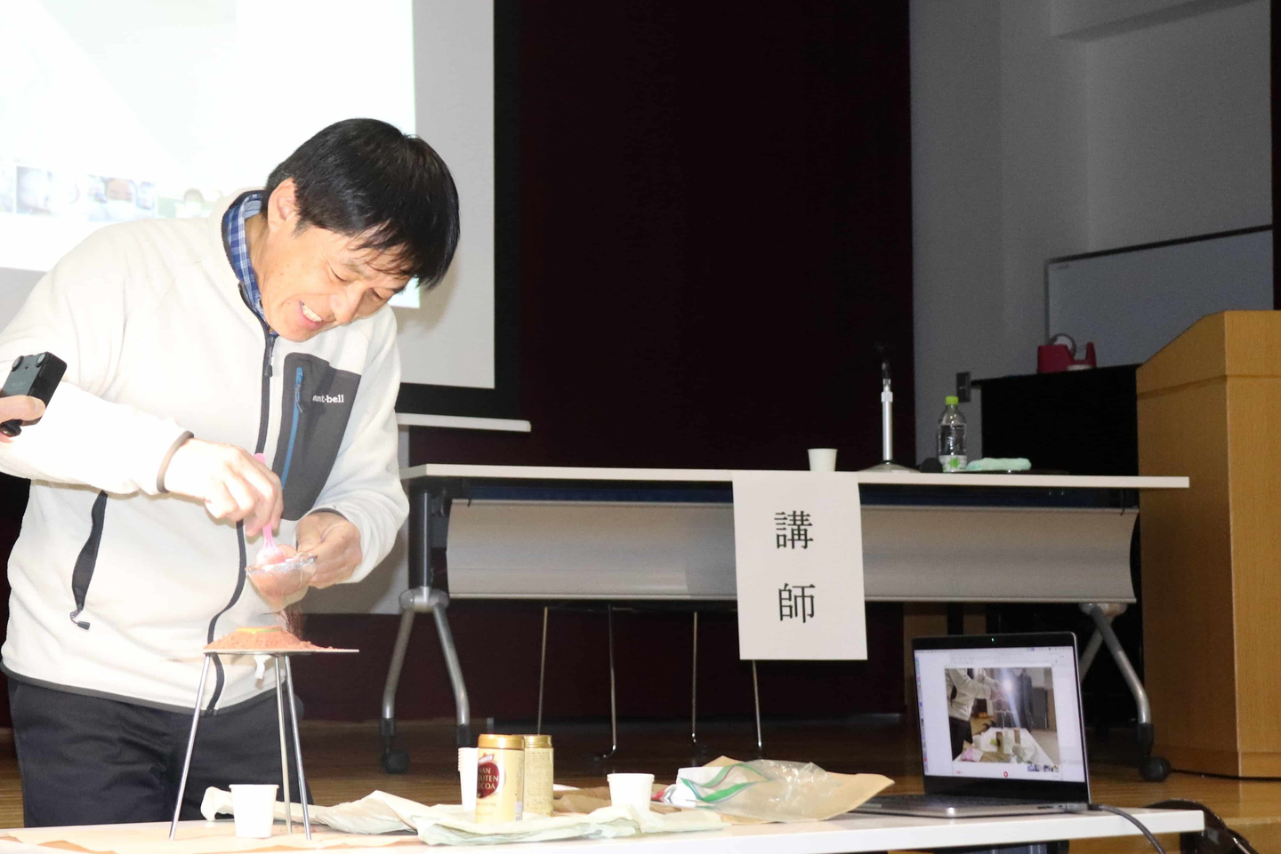 テーマは私たちの住む秋田の「火山」。十和田湖や田沢湖の形成に秘められた壮大なスケールの歴史に、会場からは時おり驚きの声が上がりました。特に盛り上がったのは身近な材料を使った実験コーナーです。ココアとコンデンスミルクでカルデラができるしくみを再現するマジックのような解説に会場の視線は釘付けに。